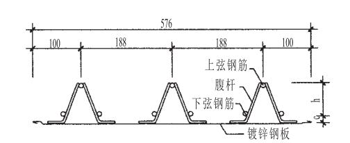 钢筋桁架楼承板是将混凝土板中的钢筋与施工模板组合为一体,组成一个在施工阶段能承受湿混凝土自重及施工荷载的承重构件,并作为钢梁的侧向支撑;在使用阶段钢筋桁架与混凝土共同工作,承受使用荷载。