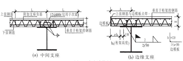 ⑴钢筋桁架楼承板铺设与钢梁连接,板端头与钢梁熔透点焊,中间采用栓钉与钢梁穿透熔焊;钢筋桁架楼承板间用专用夹紧钳咬合压孔连接;端头用专用镀锌边模钢板与钢筋桁架楼承板或钢梁点焊;典型连接方法如图。
