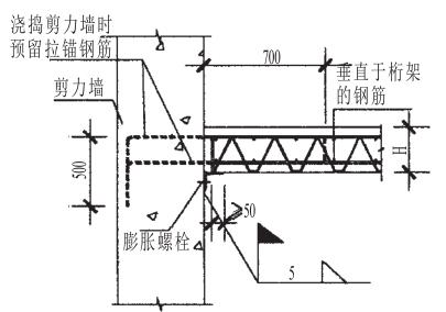 ⑵在钢筋桁架楼承板与混凝土墙连接时,应加设角钢,并用膨胀螺栓固定在混凝土墙上,如图4。