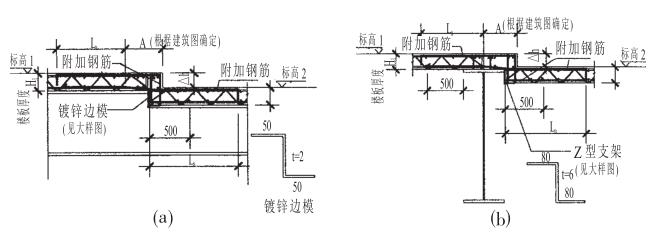 ⑴当楼面层结构标高变化不一时,采取加焊Z型支架及附加钢筋措施,使水平结构呈台阶过渡,如图a;