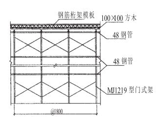 部分钢桁架模板中间需设置临时支撑,可根据楼层高度采用多种不同高度的门式架搭设而成,门式架间距18m,上铺100×100木枋,如图。