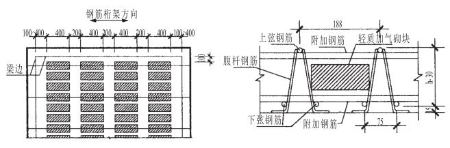 根据结构特点,为减少混凝土楼板的自重,板厚h≥140mm的板中需放置轻质加气混凝土砌块,其容重大于8kN/m³,强度等级不低于MU5,施工时每块砌块下均需加设支撑钢筋26,如图所示。